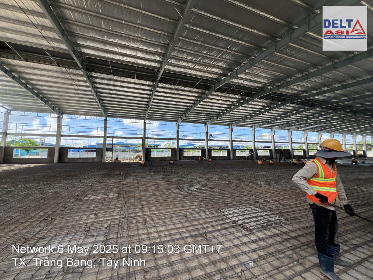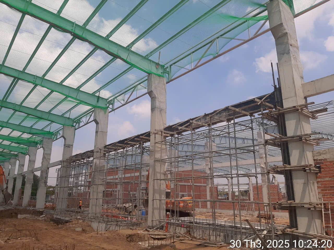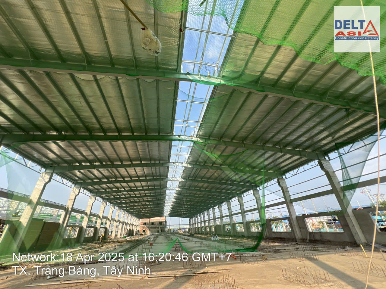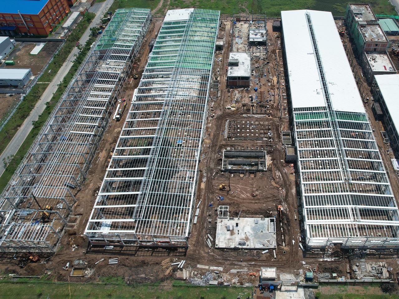 完成钢屋架施工并进行屋面彩钢板安装后的工程整体情况