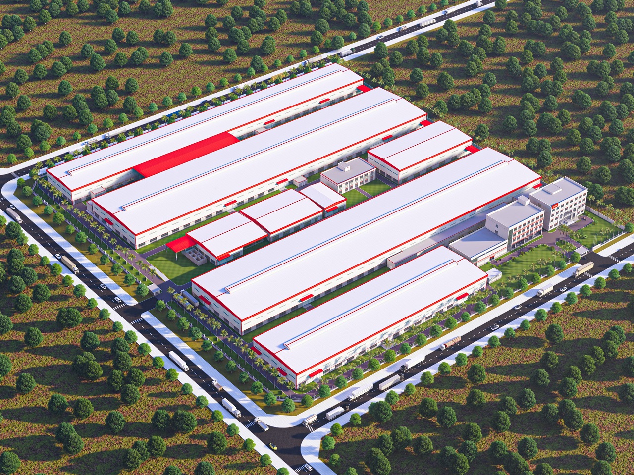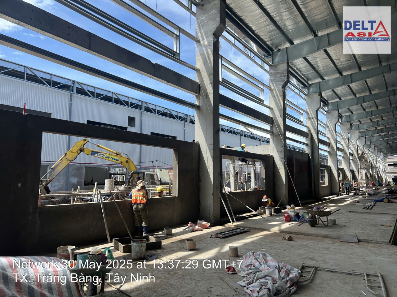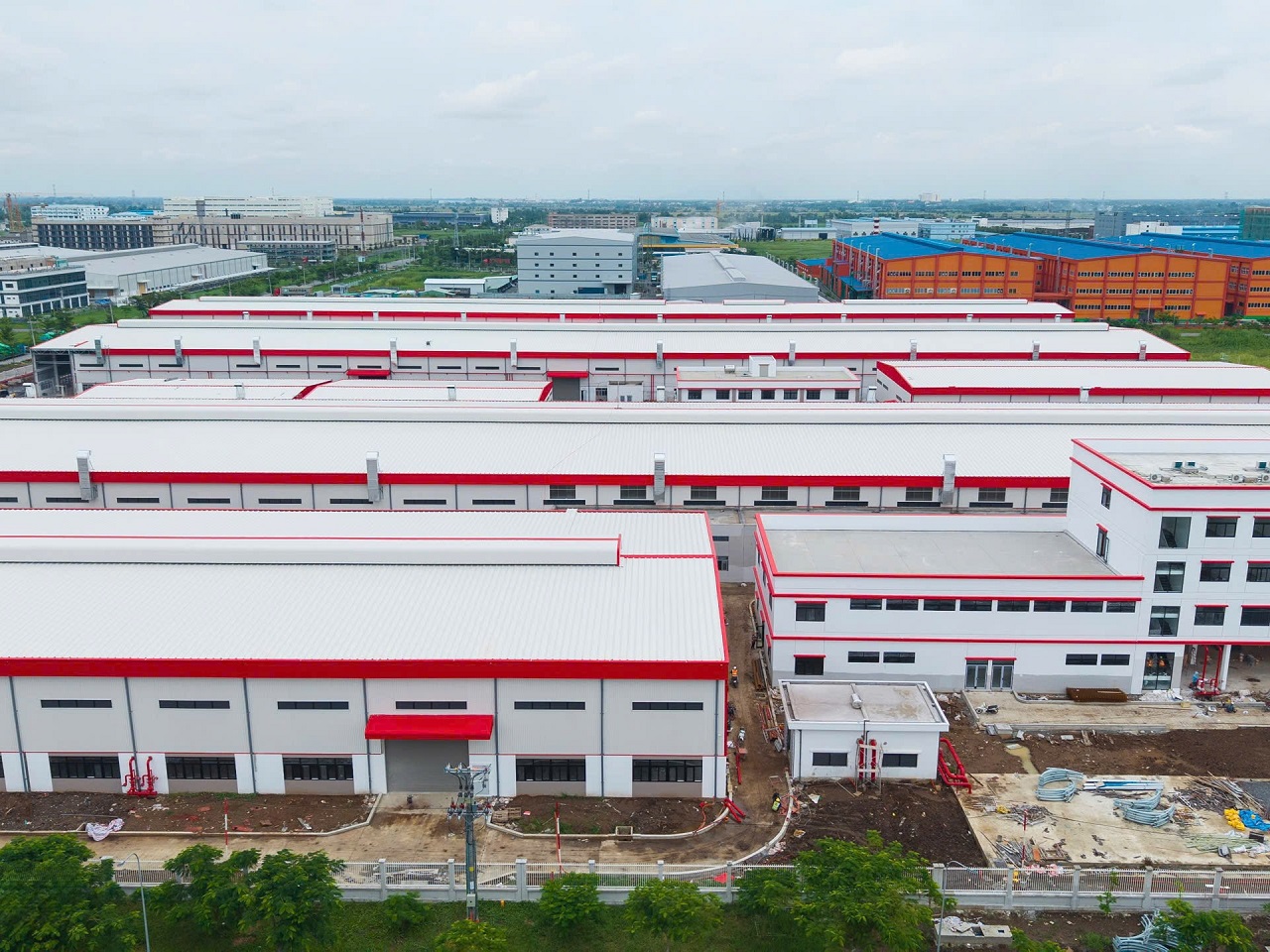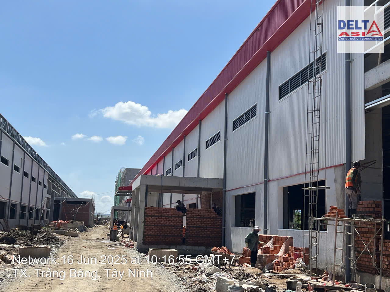 完成钢屋架施工并进行屋面彩钢板安装后的工程整体情况