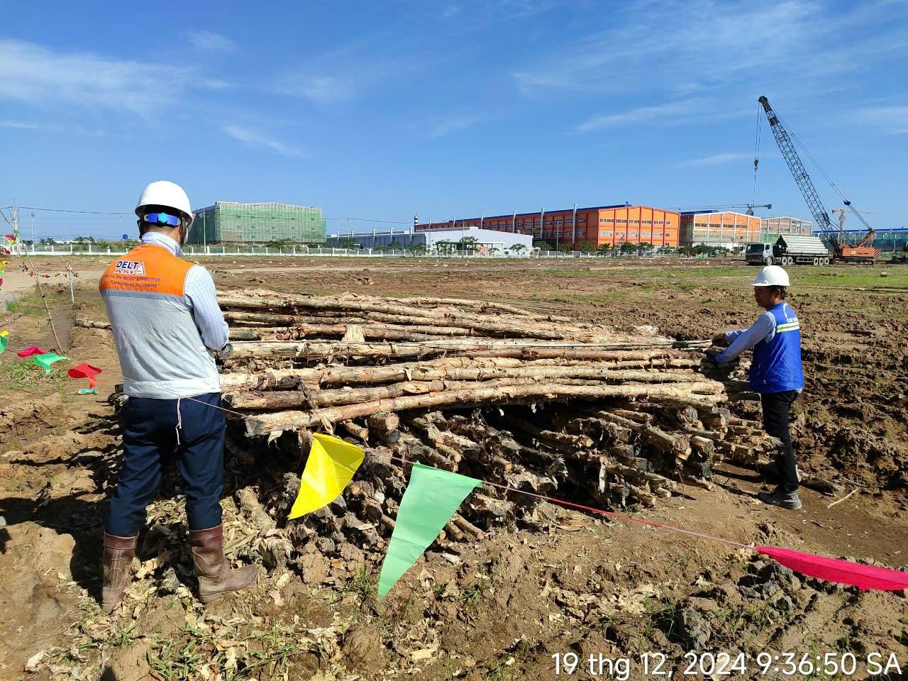 运至施工现场的白千层木桩材料验收